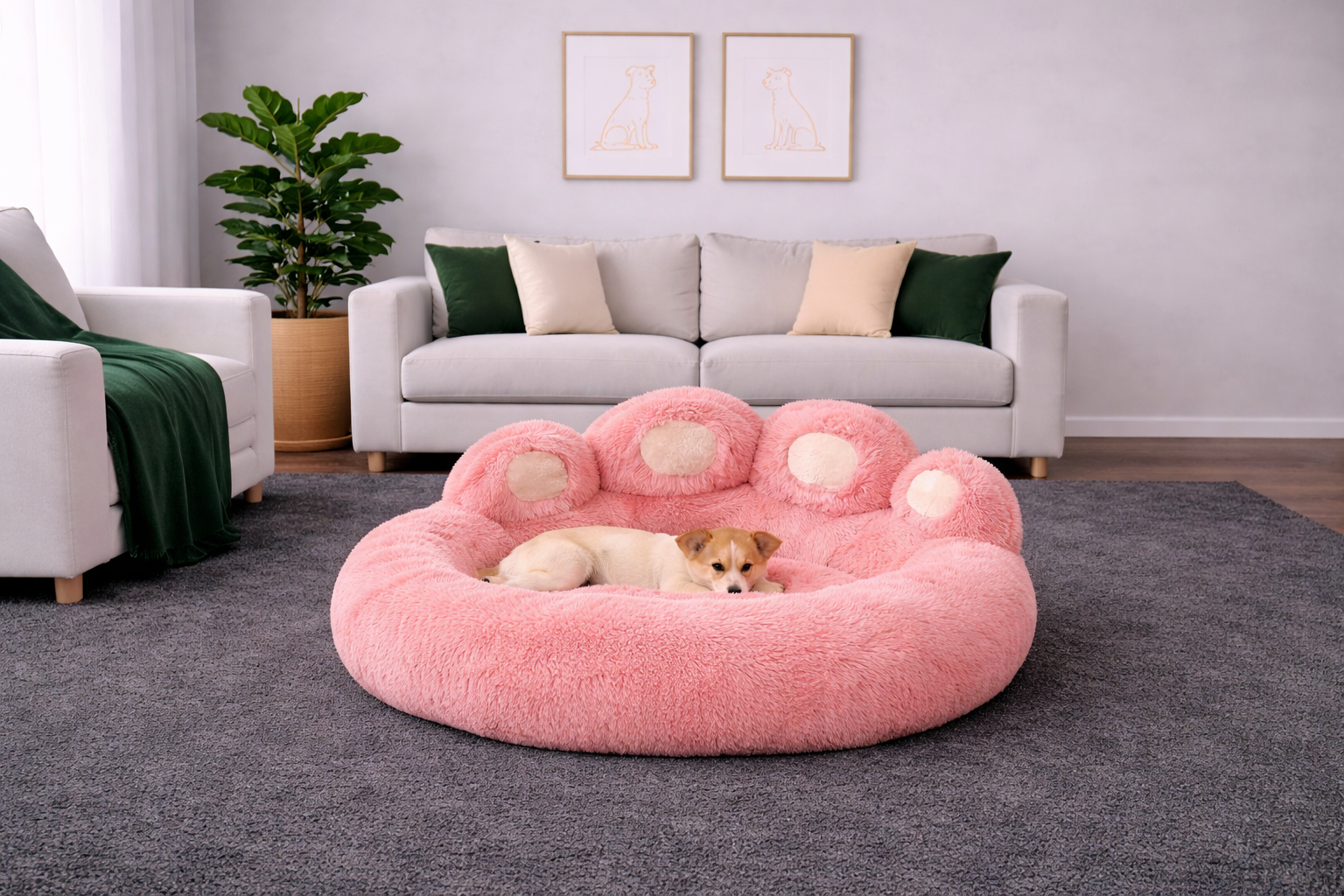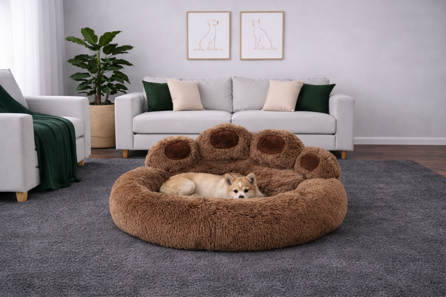 Cama de felpa en forma de huella, diseñada para envolver a tu perro en una sensación de calma y seguridad. Su textura ultra suave y su acolchado mullido crean un refugio perfecto para descansar, relajarse y dormir profundamente.