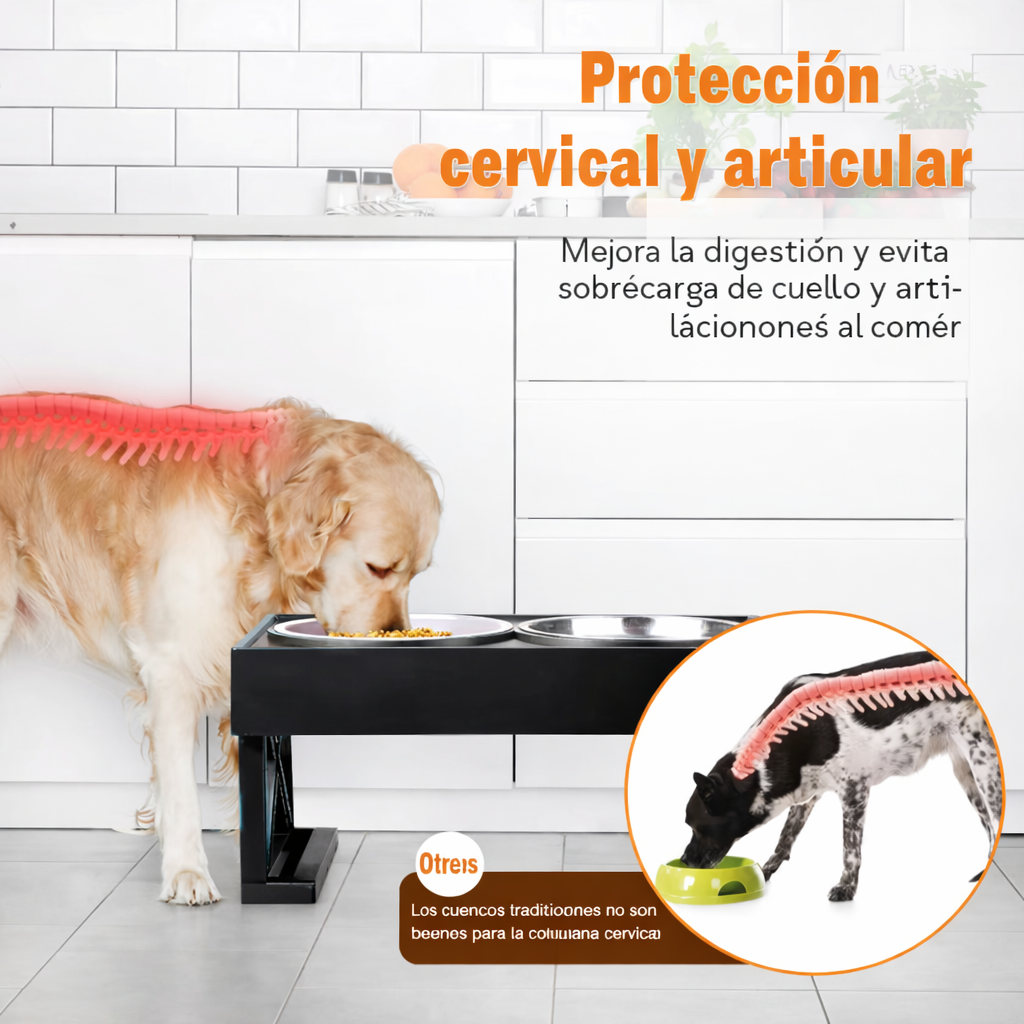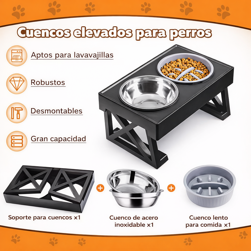 Cuencos elevados dobles diseñados para mejorar la postura y el confort de perros medianos y grandes durante la comida. Su altura ajustable ayuda a reducir la presión en cuello y articulaciones, favoreciendo una mejor digestión. Incluye platos de alimentación lenta y un soporte estable que evita deslizamientos y derrames. Fabricados con materiales resistentes, son fáciles de limpiar y perfectos para servir agua y comida de forma cómoda y ordenada.